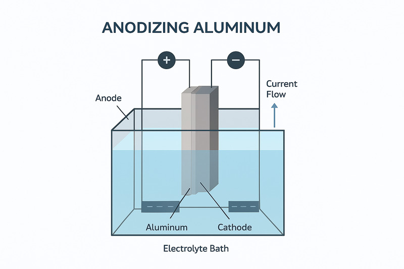 | 4. Anodizing | Parts are submerged in a sulfuric acid bath while connected to the positive terminal (anode). An electric current drives the oxygen reaction, forming aluminum oxide. |